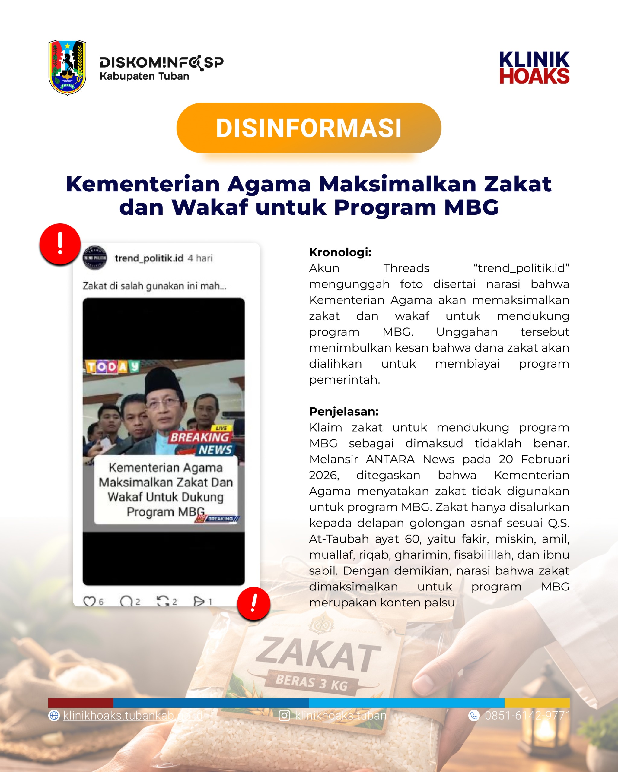 Akun Threads “trend_politik.id” mengunggah foto disertai narasi bahwa Kementerian Agama akan memaksimalkan zakat dan wakaf untuk mendukung program MBG. Unggahan tersebut menimbulkan kesan bahwa dana zakat akan dialihkan untuk membiayai program pemerintah.