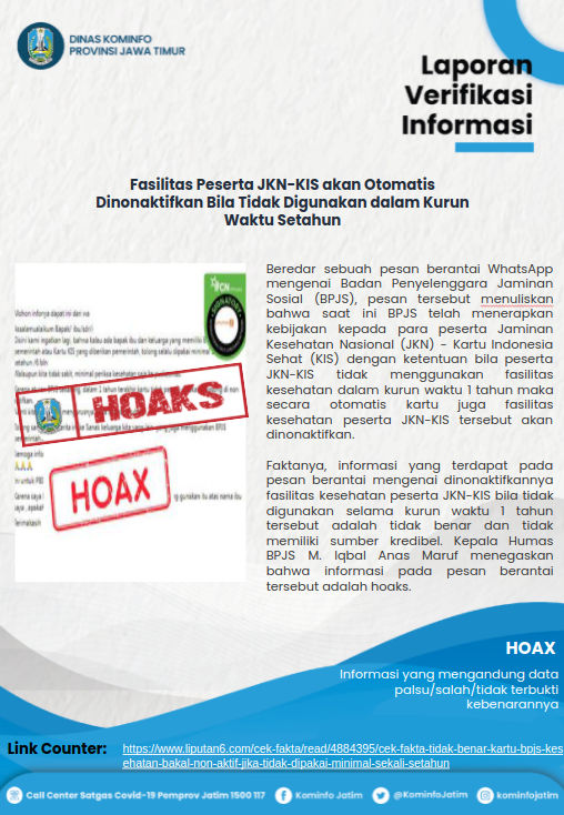 Hoax, Fasilitas Peserta JKN-KIS akan Otomatis Dinonaktifkan Bila Tidak Digunakan dalam Kurun Waktu Setahun